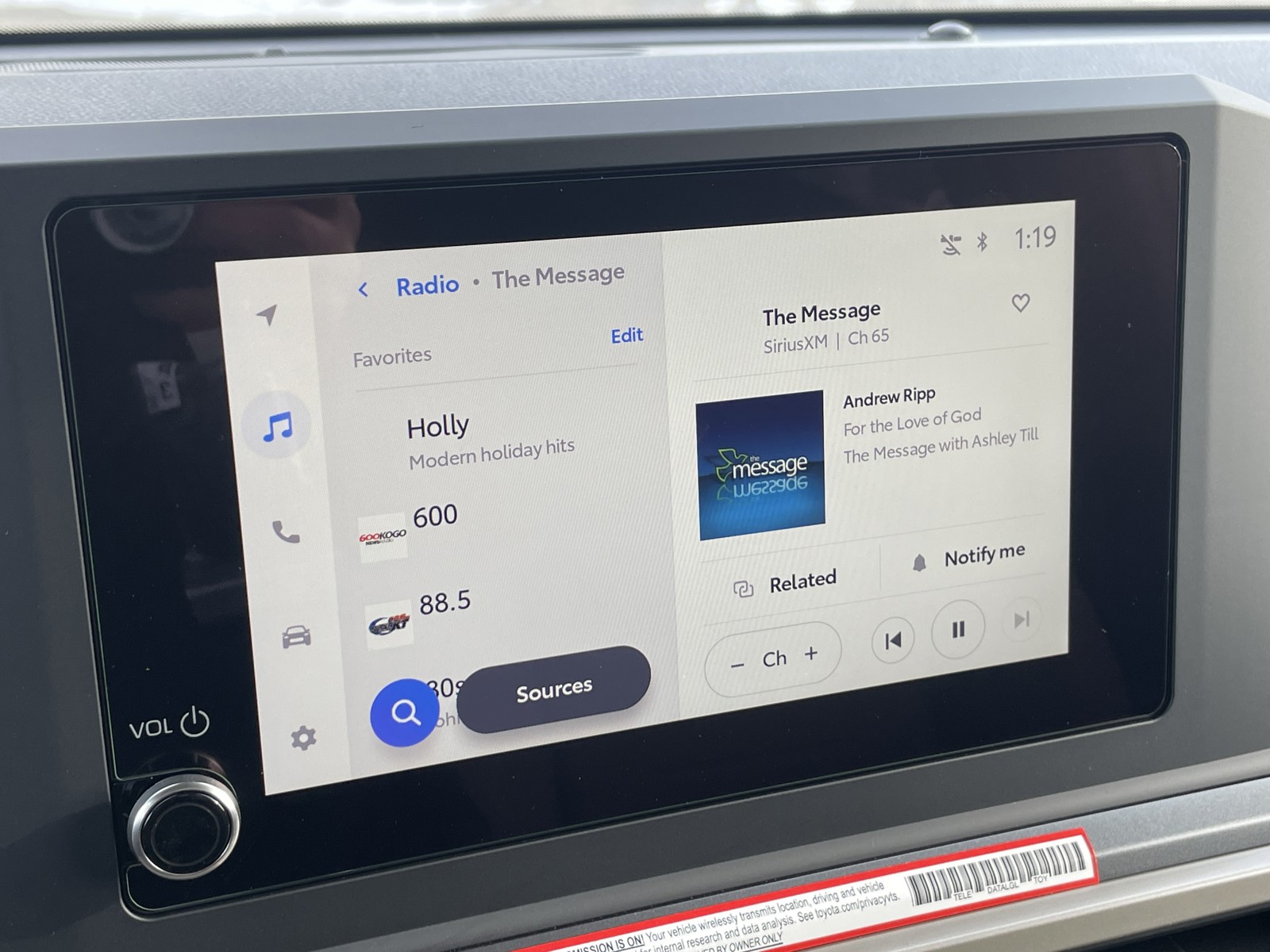 - 8-in. Toyota Audio Multimedia display with 6-speaker audio system, wireless Apple CarPlay® & Android Auto™ compatibility, SiriusXM® 3-month trial. See toyota.com/connected-services for details.