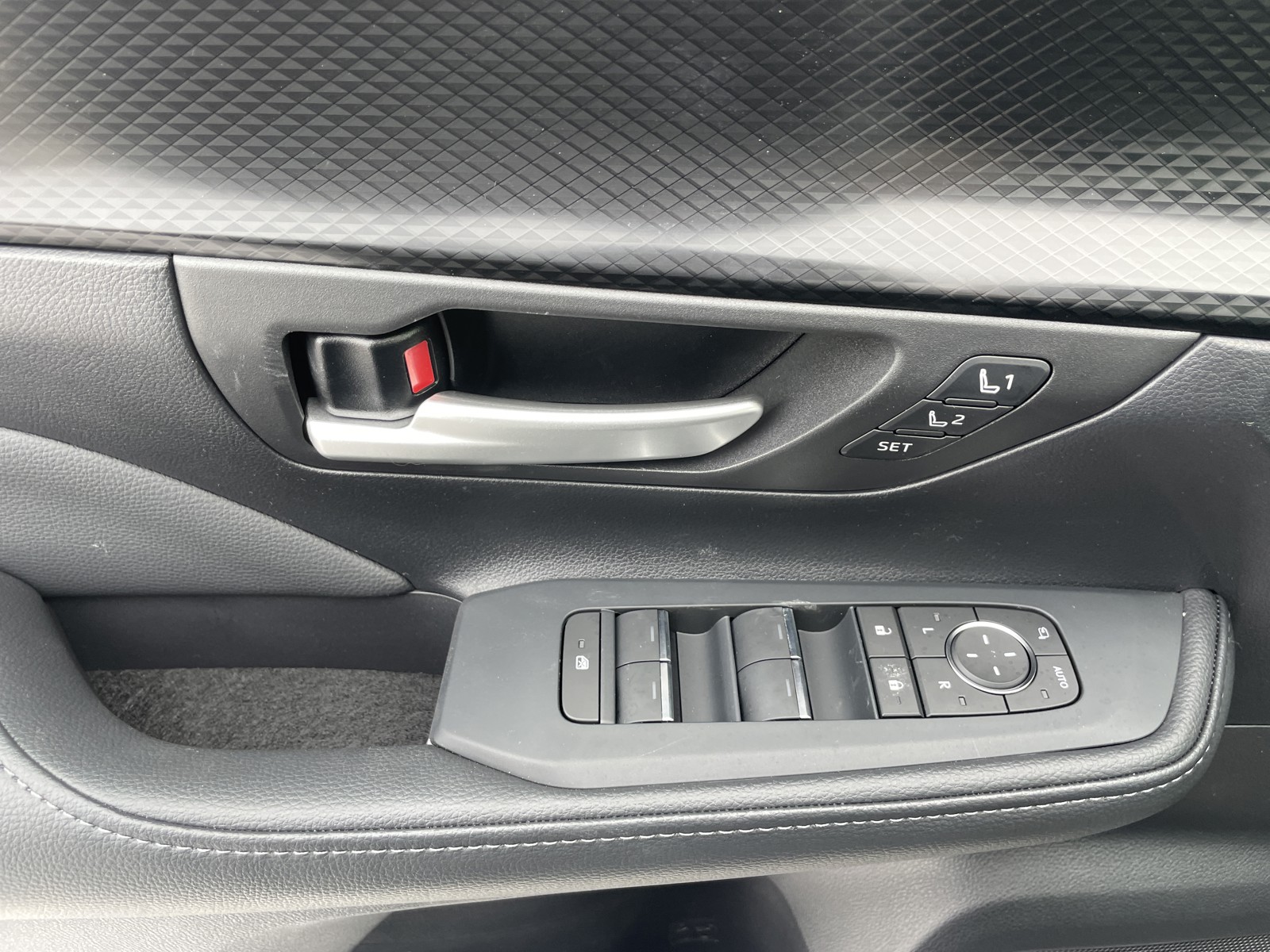- Bronze-colored dashboard trim and black geometric-pattern door trim