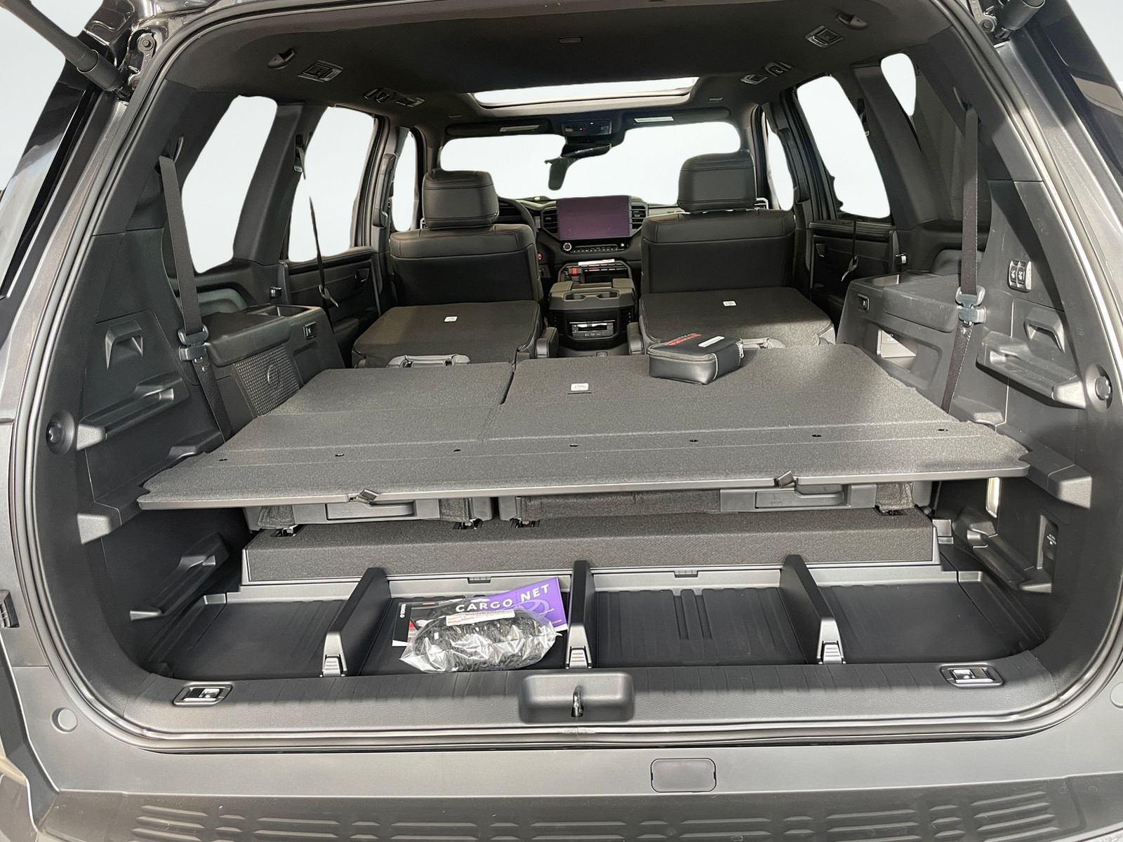 - Reclining, fold-down, fold-up, tumble-forward captain's chairs with center armrests on outboard seats; adjustable headrests; one-touch access to third row