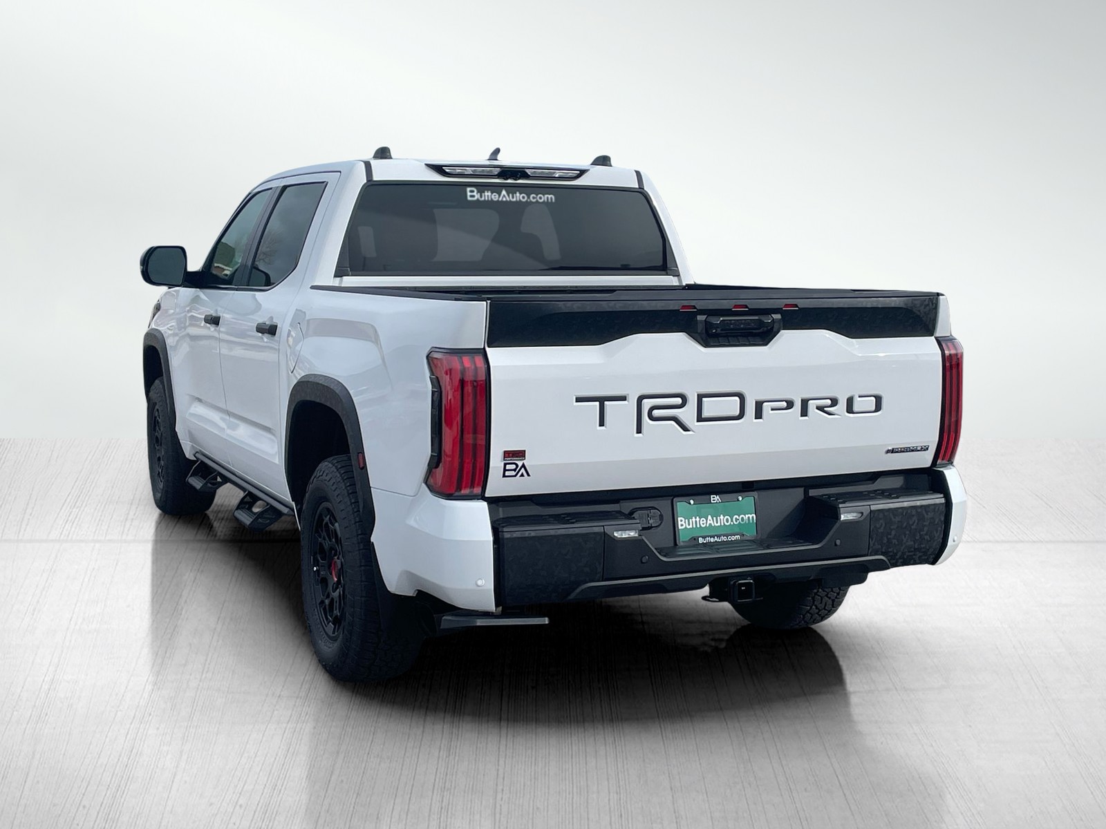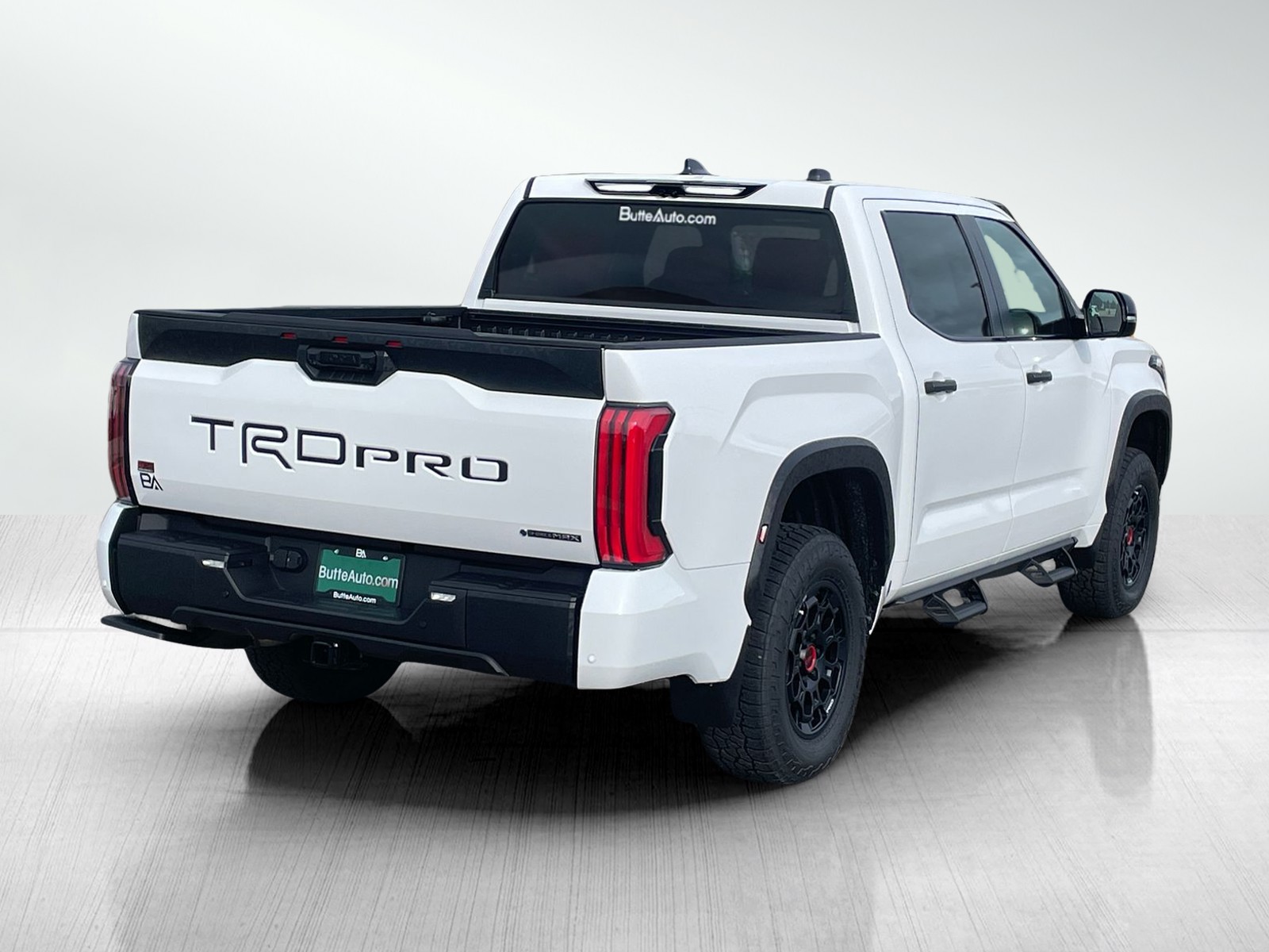 - "TRD PRO" hood badge; black door handles; black window molding and mirror caps; black technical-camo-grained tailgate spoiler and overfenders with marker lights
