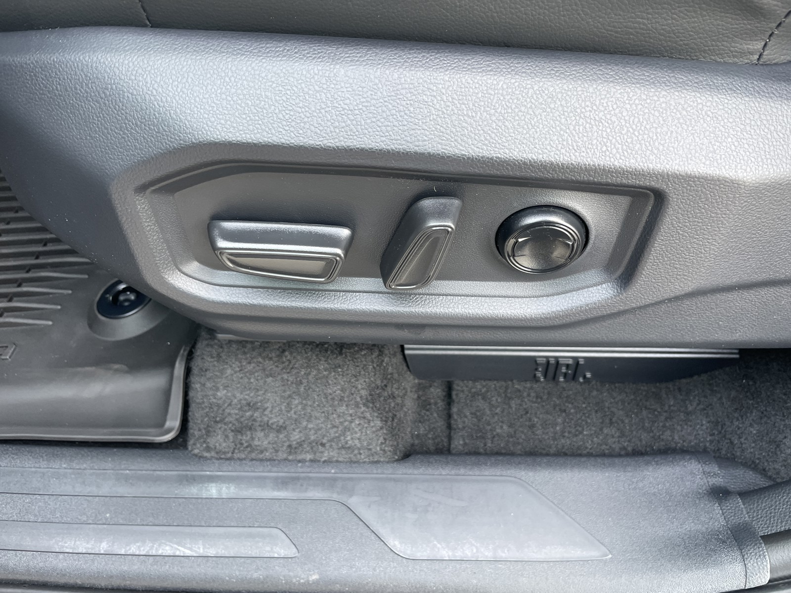 - Leather-trimmed seats with contrast stitching; 8-way power-adjustable driver and front passenger seats with power-adjustable lumbar support